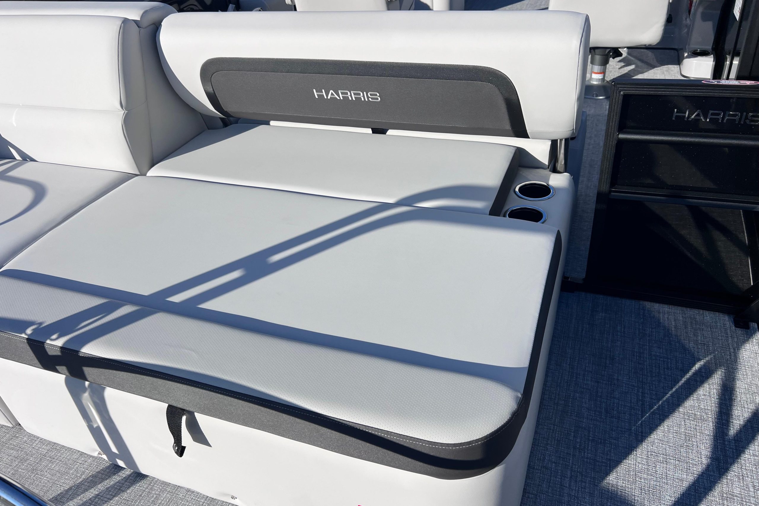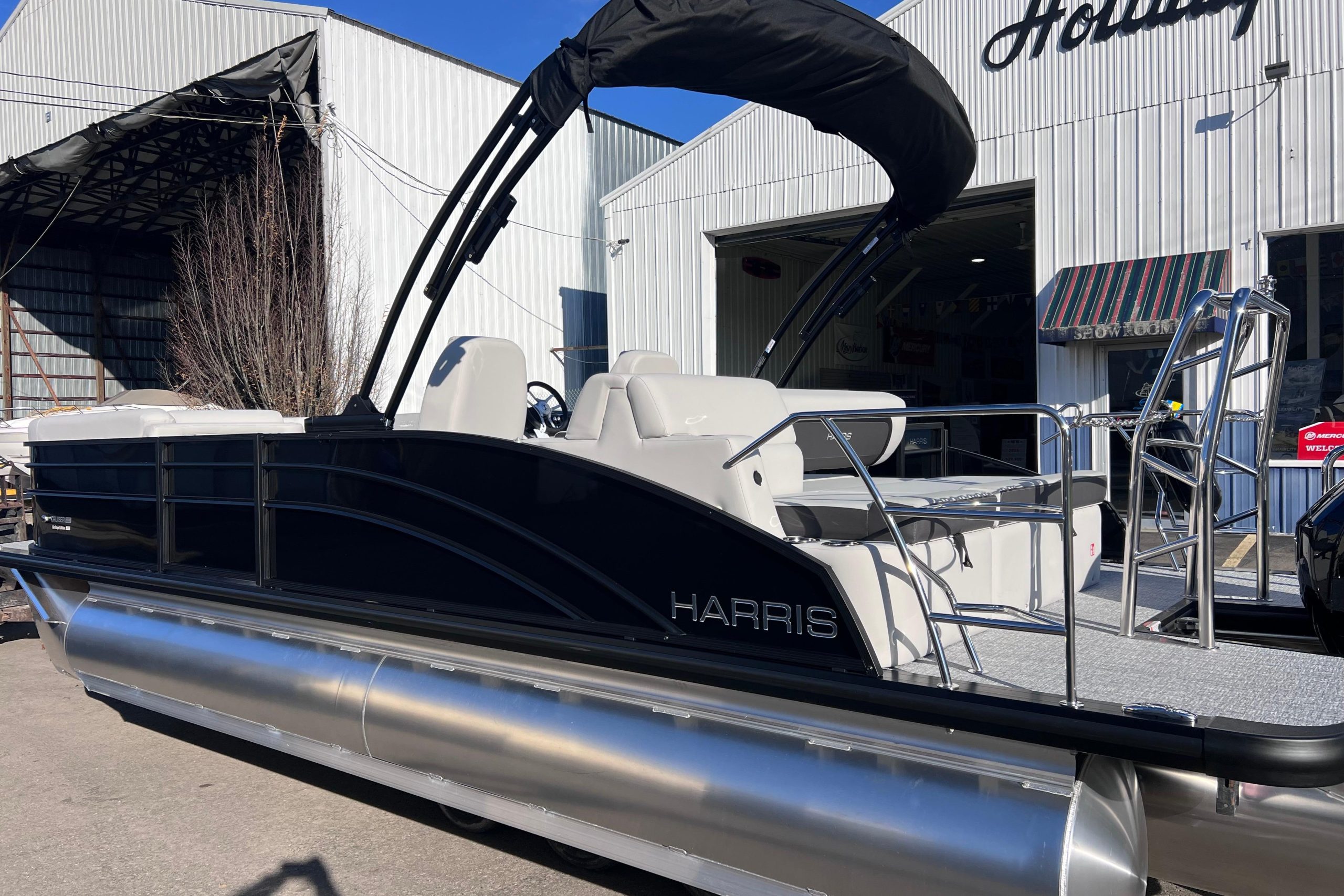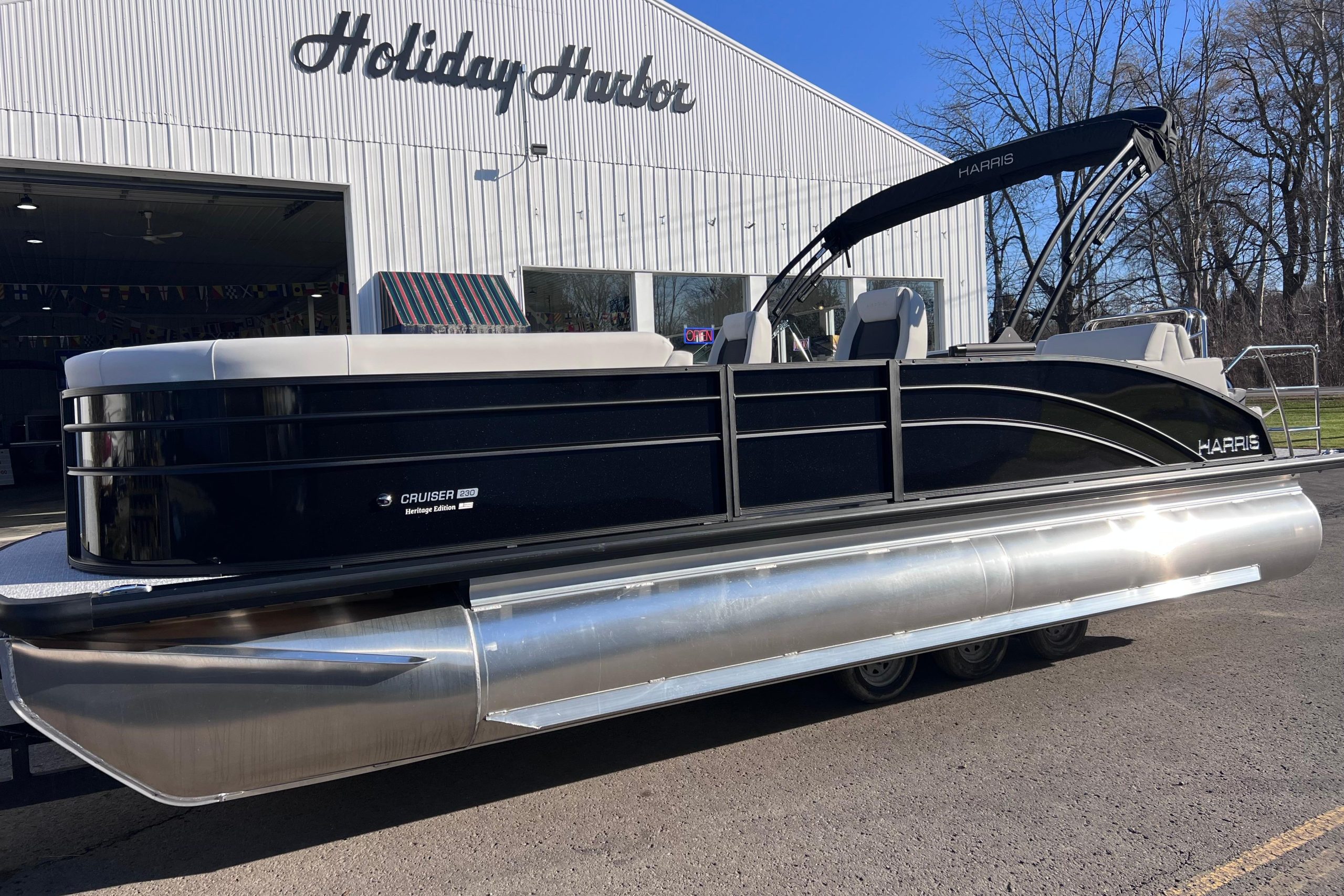 All NEW 2026 Harris Pontoon. She is the Cruiser 230 SLDH Tri-Toon Model with the cool real adjustable lounger. Beautiful Ebony Metallic with the Black Edition. Her interior is Tungsten with matching vinyl weave flooring. She is powered by her Mercury 150 HP and hydraulic Steering. She is loaded with options including her Power Bimini, LilliPad upgraded Ladder, Ski Tow Bar, Wireless Charger at the Helm, WetSound Speakers with Bluetooth Stereo…just to name a few options. We are open year round. Stop down in our heated showroom to see this beauty.
