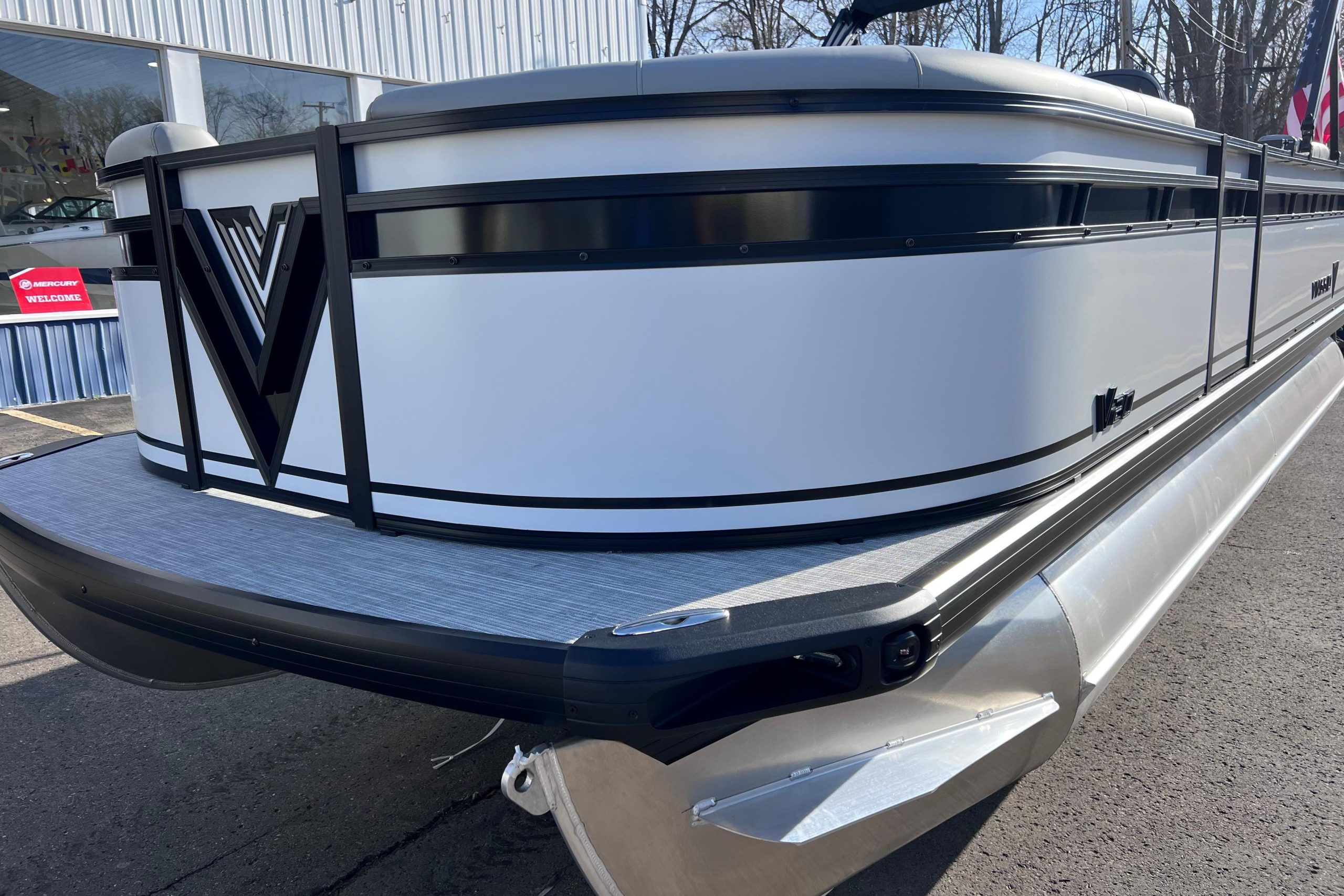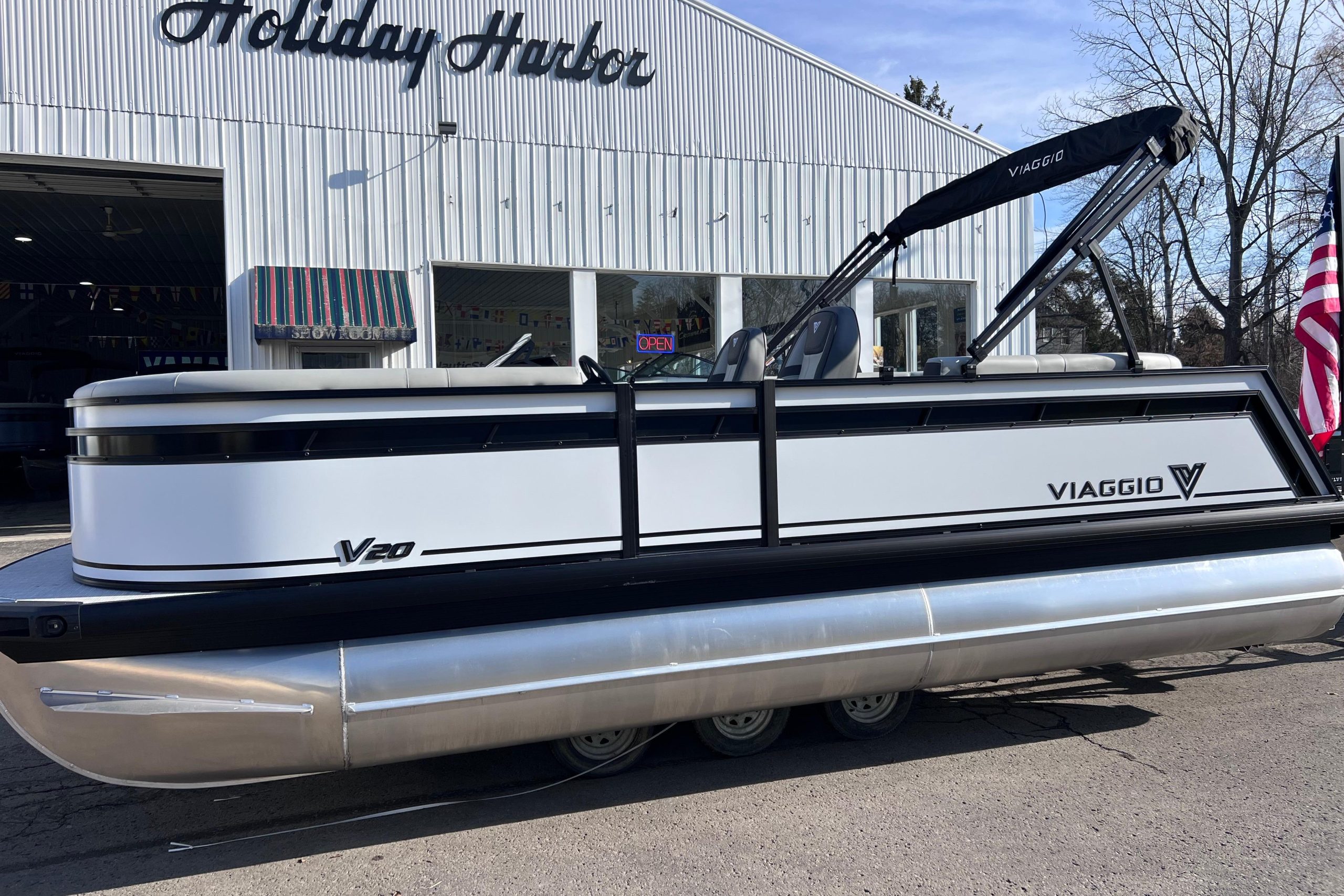 All NEW 2026 Viaggio Pontoon. She is a V 20U model with an overall deck length of 21’6″ that includes her extended aft swim platform. She is powered by her Mercury 115 Command Thrust. Sharp White exterior with black rails, Grayson interior and Thatch Quartz flooring makes her stand out. She has her under deck aluminum shield for added performance, SeaStar Hydraulic Steering, upgraded Lillipad Boarding Ladder, USA Aft Mount Flag, Lowrance Eagle 5 Depth/Fish/Chart. She also comes with a wireless phone charger at the helm, plenty of USB ports, upgraded stereo with Bluetooth, Xtreme Ski Tow Bar, portable cup holders and pontoon side keel guards. I love the new heavy built angled corners with the built in LED Docking Lights and Navigation Lights. Viaggio has been building pontoon boats for over 35 years and comes with an industry leading warranty. We are open year round. Stop down in our heated showroom to see this beauty.